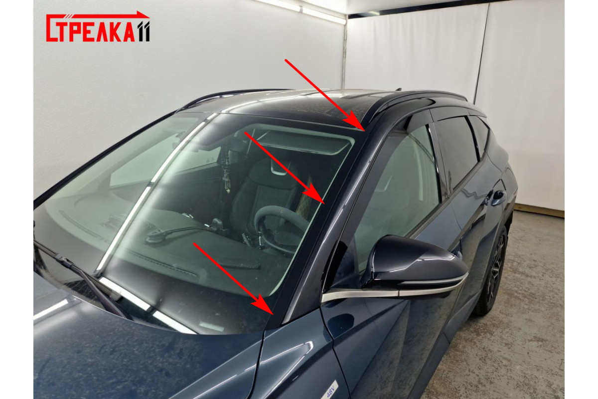 - Устанавливается дефлектор на переднюю стойку автомобиля, по всей длине стойки к ближнему краю лобового стекла. (рис.1)