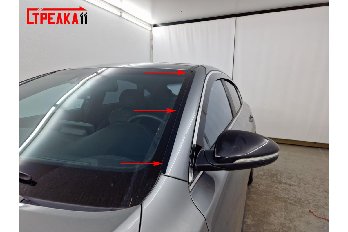 • Начните установку с нижней части стойки лобового стекла (рис. 2)
