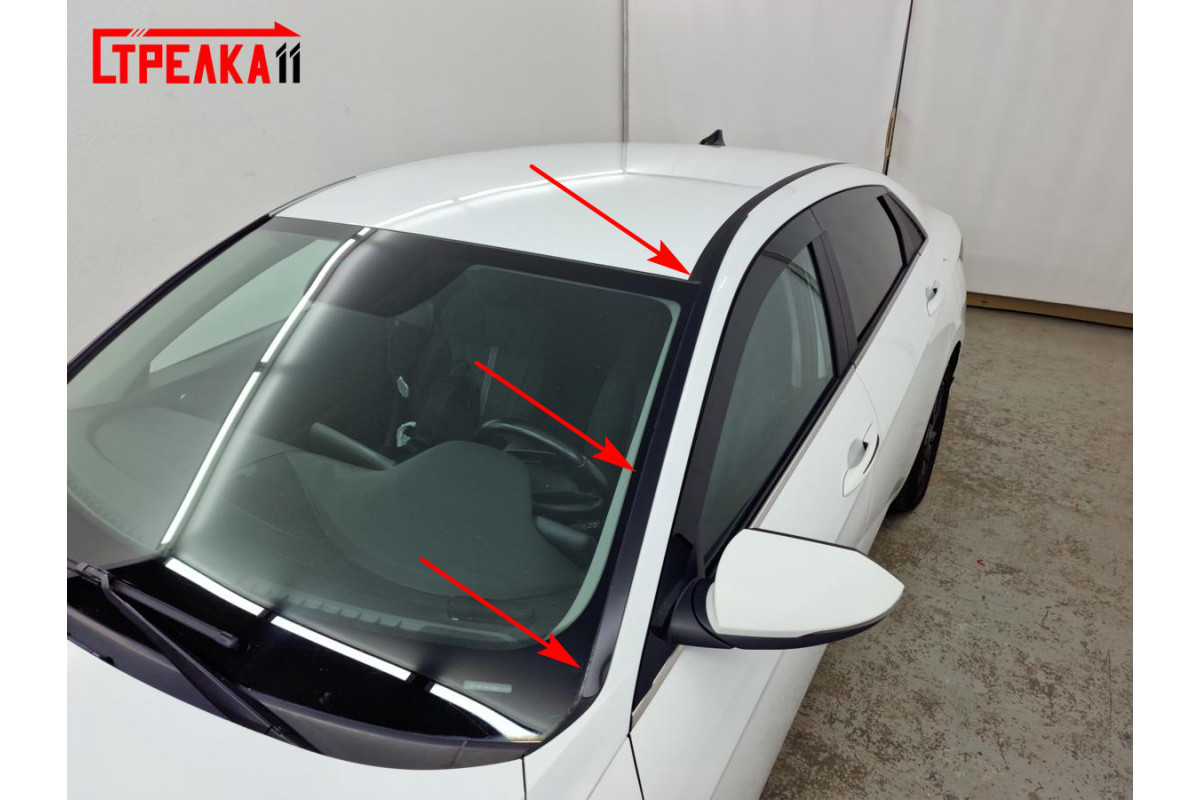 • Начните установку с нижней части стойки лобового стекла (рис. 2)