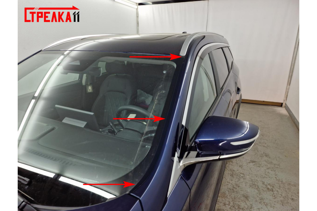 - Начните установку с нижней части стойки лобового стекла (рис. 2)