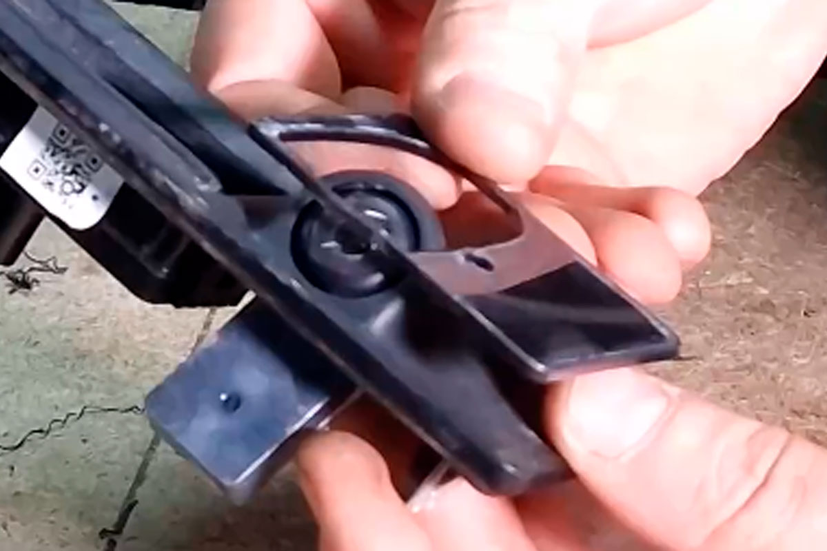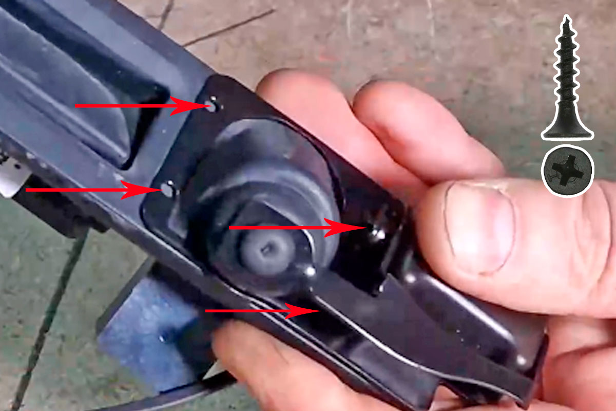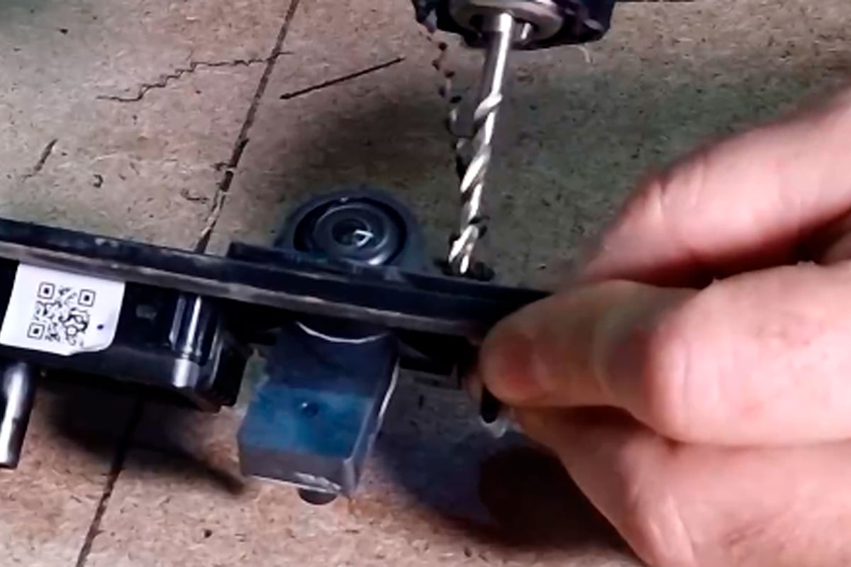 Сверлом 1.5мм (поставляется в комплекте) высверливаем оставшиеся отверстия под крепеж (рис.4). Затем маленькими, затемненными саморезами из нержавеющей стали фиксируем защитное устройство на его посадочном месте (рис.5). Повторно (аккуратно) проверяем свободный ход крышки защитного устройства и плотность ее прилегания к камере заднего вида. Установить блок камеры обратно в штатное место (рис.6) и вывести провода от редуктора внутрь багажного отсека.
