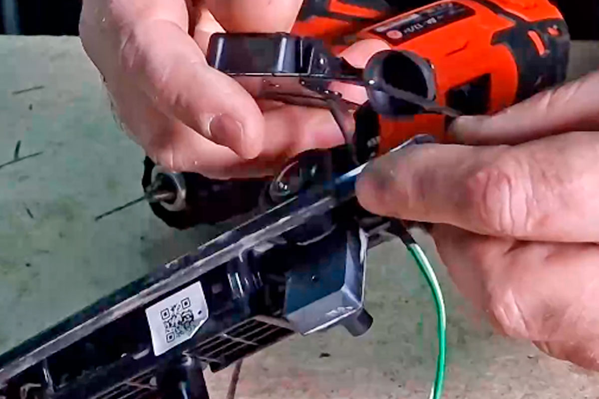 После того как просверлили отверстие диаметром 4мм, необходимо продеть провода в только что просверленное отверстие (рис.3), приложить защитное устройство к месту его будущего крепления. Ручным воздействием на механизм (аккуратно и плавно) закрыть крышку защитного устройства и проверить плотность ее прилегания к камере заднего вида. Если крышка прилегает плотно, отметить места крепления защитного устройства.